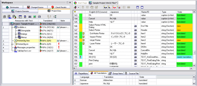 RC-WinTrans has improved project management features that make it easy to organize and work with various projects. Projects can contain any number of files (and file types) (Figure 1) and you can work on multiple projects simultaneously. You'll find a summary of the contents of each open project in the Projects Overview tab (Figure 1)and the Project Data view (both located in the Workspace bar) lets you find and isolate translation data with selected filter buttons. The Project Data view also shows translation status statistics and other (optional) information, such as notes.