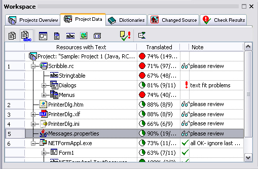 The Workspace bar's Project Data tab view (Figure 3) shows the contents of the current translation project in a detailed and interactive tree view. Translation status information is also shown here so you can easily monitor the progress of the project and the items contained therein. Use the command buttons found in the view to filter the project's data in different ways (e.g., show only items with text, show all non-translated items, etc.). |